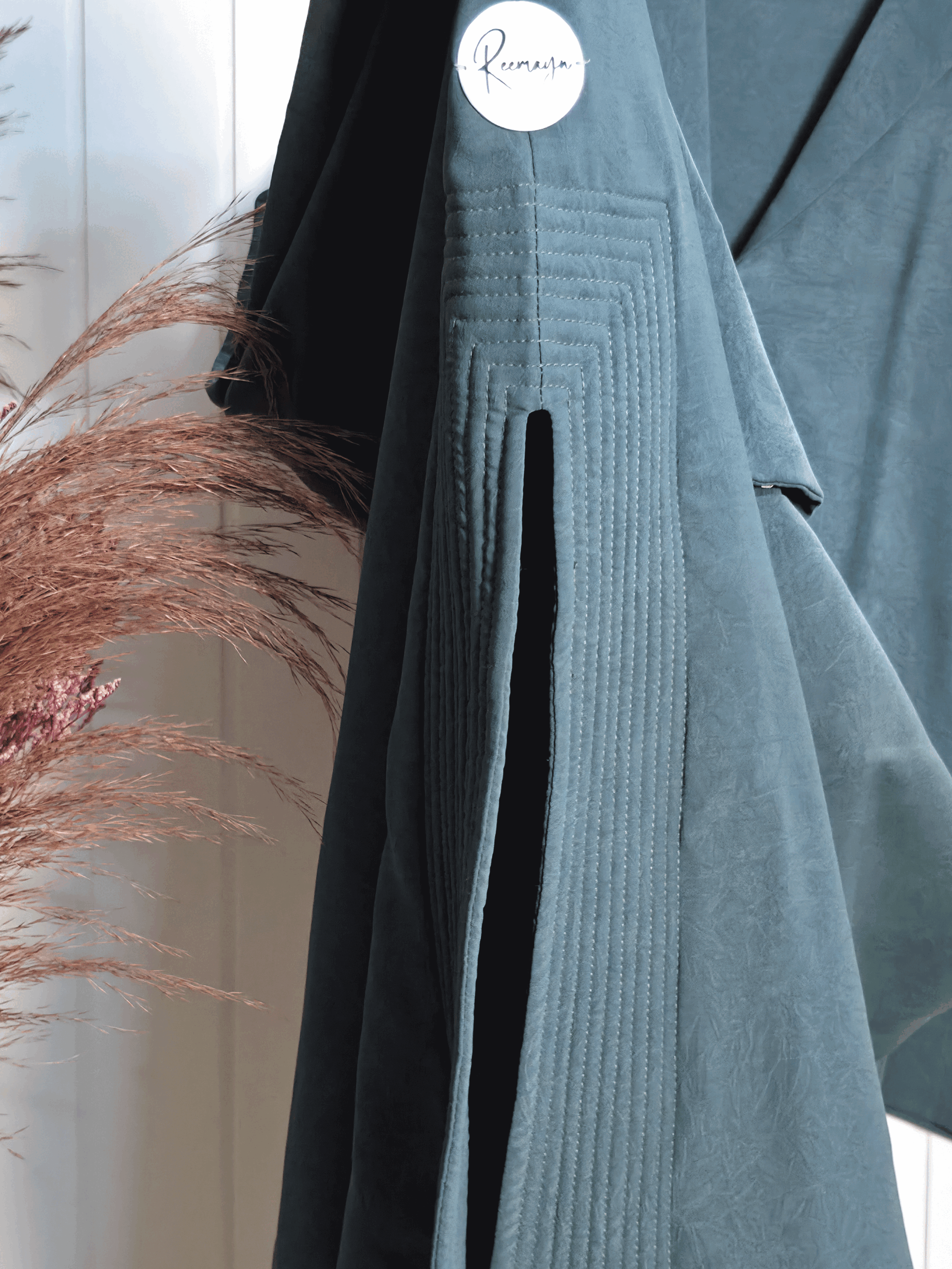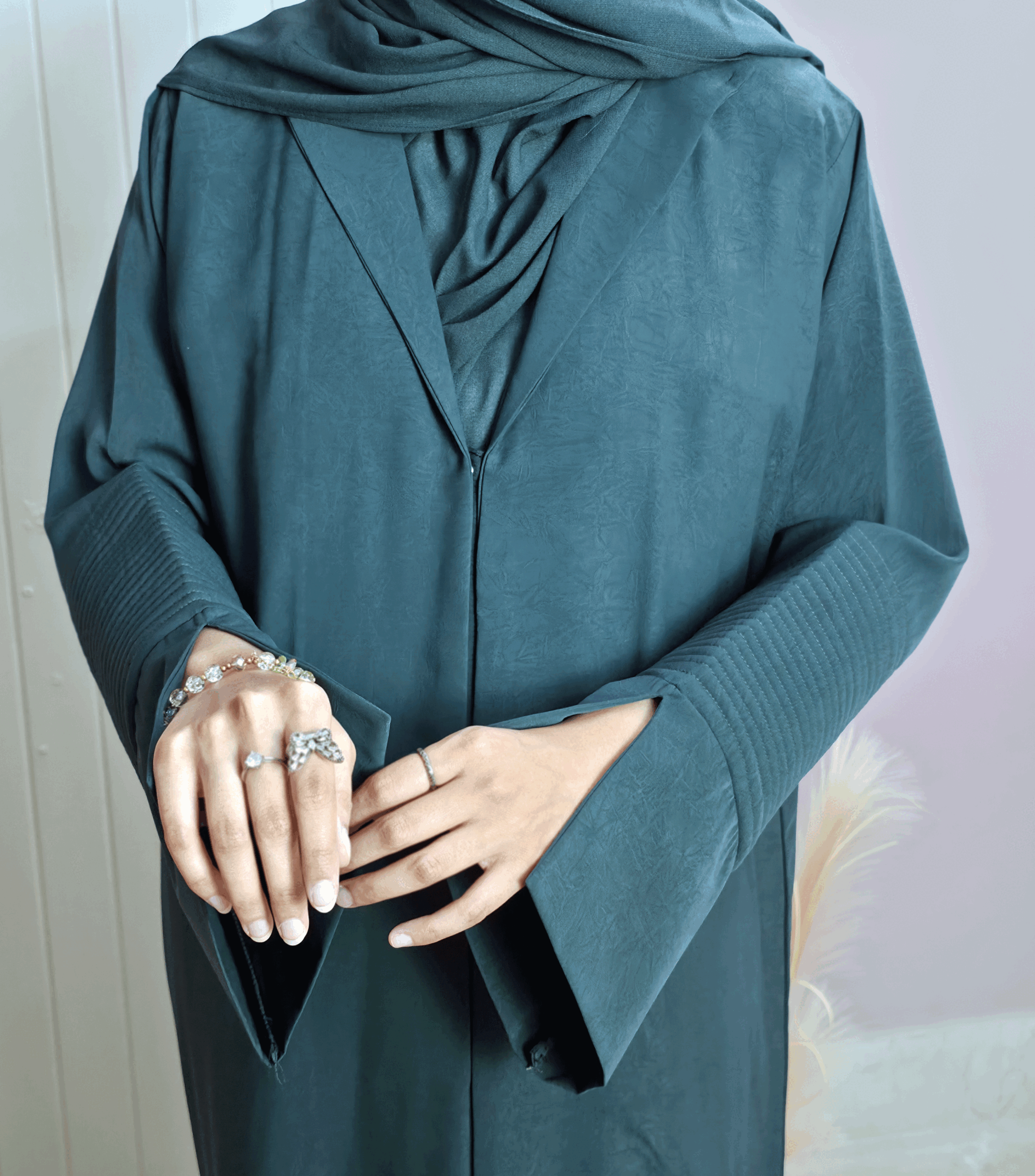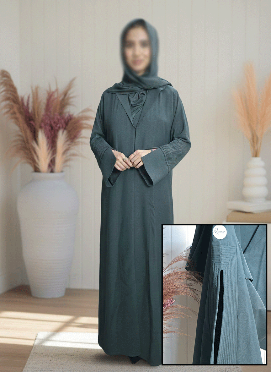 Introducing Eshaal, where modern structure meets understated luxury. Crafted from a premium, Soft Arwa fabric in a deep forest teal, this abaya offers a unique textured finish and a sophisticated silhouette. The design is defined by its clean lines and industrial-inspired details, creating a look that is both professional and fashionable perfect for the modern woman’s workplace or University.