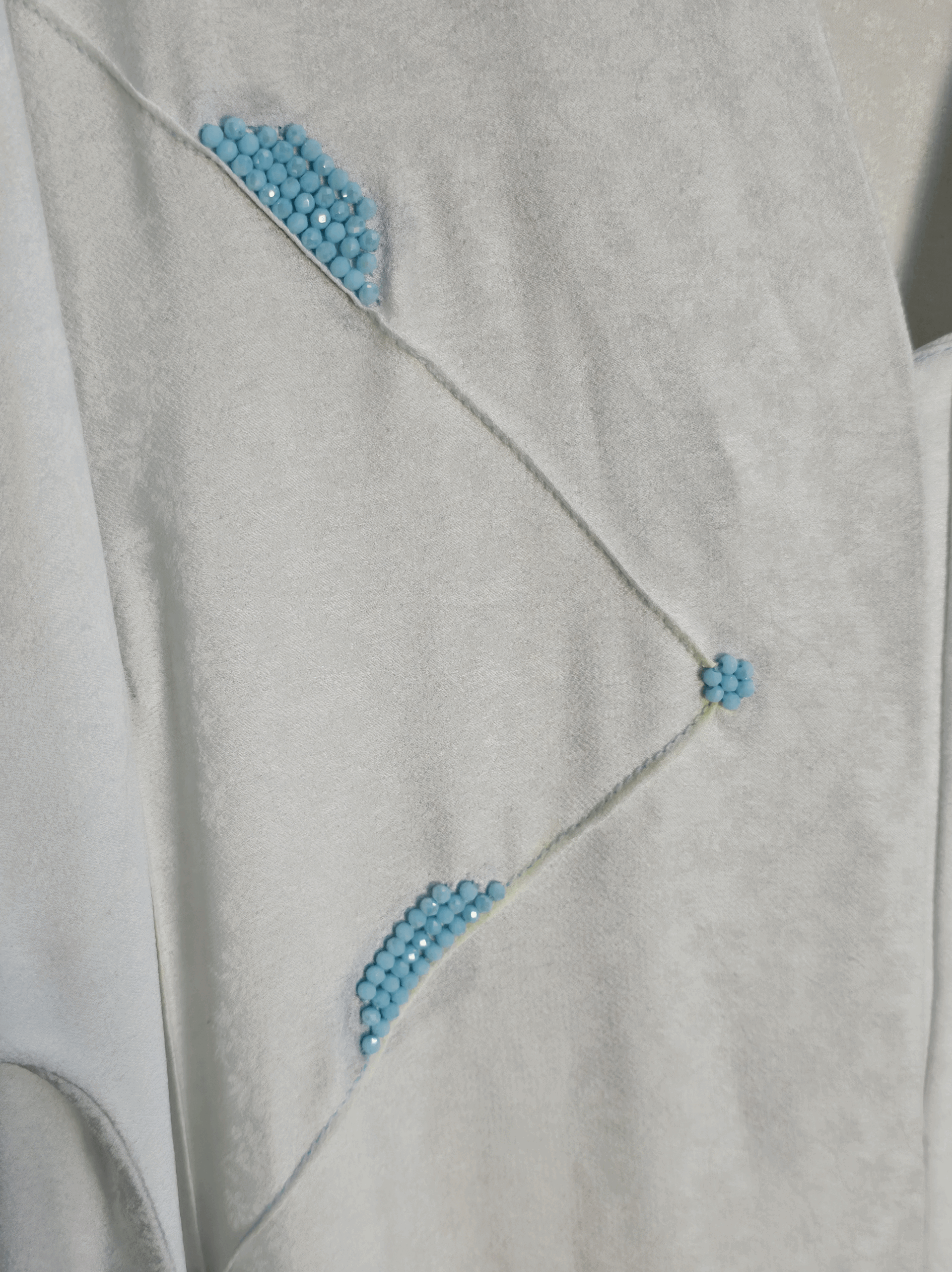 - Subtle Sleeve Accents: The cuffs carry through the beaded theme with light scattering, ensuring a cohesive design from the shoulders to the hem.