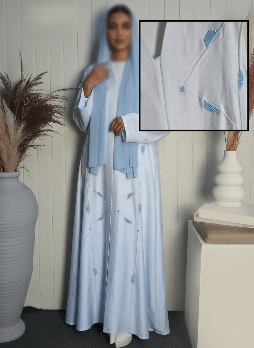 Introducing Marziah, a breathtaking fusion of ethereal color and meticulous hand-craftsmanship. Created from luxurious Laser Ombre fabric, this abaya features a stunning gradient that transitions like a clear morning sky. The design is defined by its intricate geometric beadwork and fluid movement, creating a look that is both enchanting and high-fashion—perfect for special occasions or elevated daytime elegance.